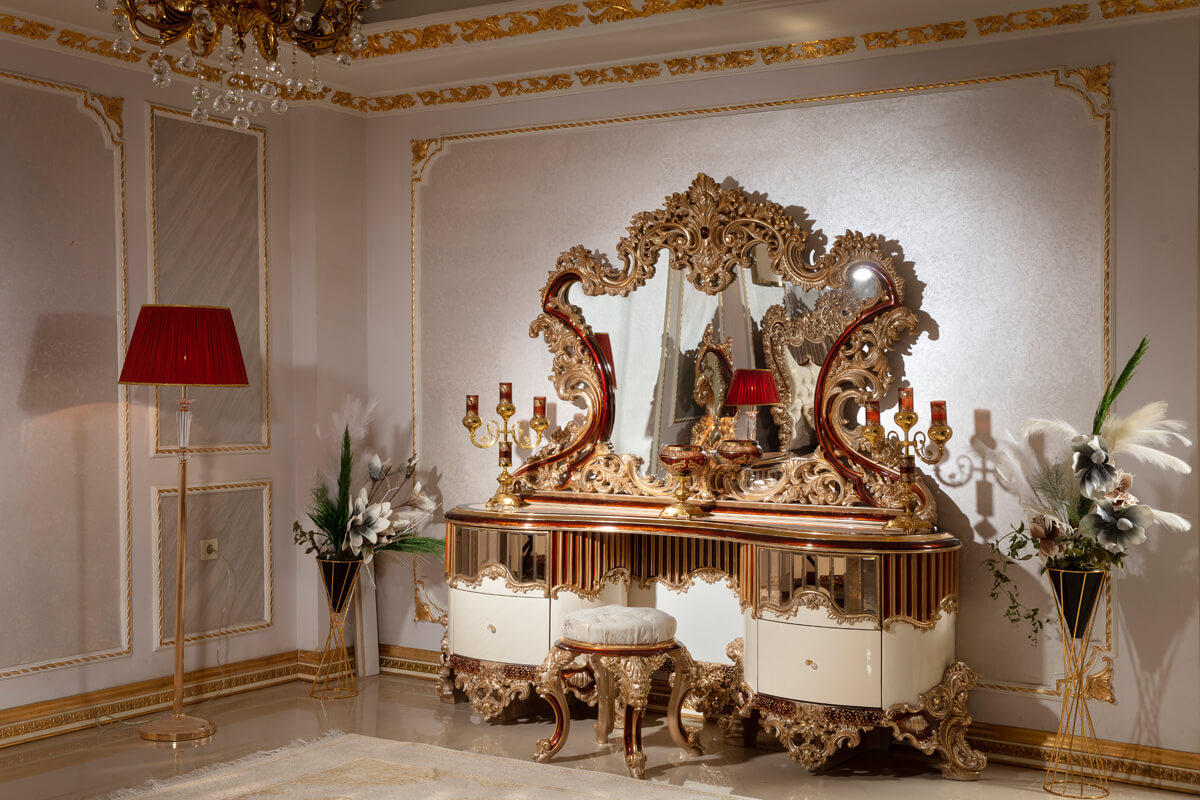 Our Luxury Loren Royal Bed Set — featuring a magnificent bed, a graceful dressing table, and two elegantly matched side tables — is designed to transform your bedroom into a haven of sophistication and serenity.